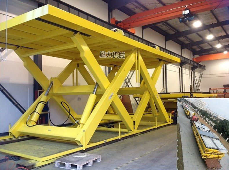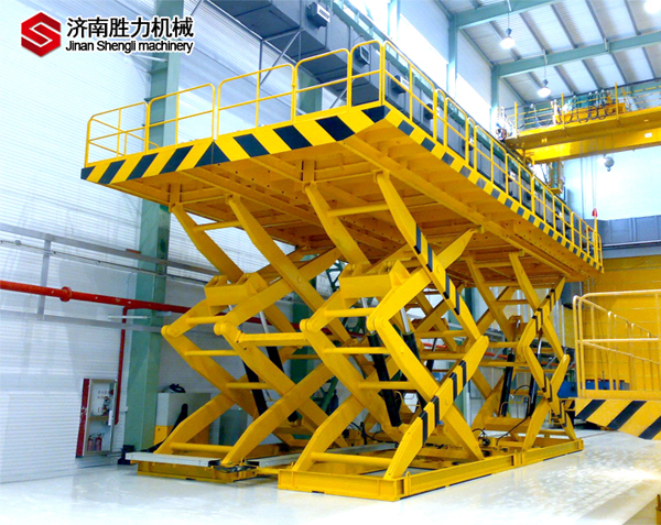 雙跨剪叉式升降平臺大多用于體積較大貨物的升降運輸,產(chǎn)品液壓系統(tǒng)設(shè)置防墜、超載安全保護裝置,各樓層和升降臺工作臺面均可設(shè)置操作按鈕,實現(xiàn)多點控制。雙跨式升降平穩(wěn)、承載能力大,可承載100噸。該設(shè)備無需樓頂機房,工作時平臺直接從地面起升,到達所需高度后自動停止,作業(yè)完畢平臺回落到與地面平齊狀態(tài),不占據(jù)地面空間,不影響通道通行。雙跨剪叉升降平臺結(jié)構(gòu)堅固,安裝維修簡單方便,是經(jīng)濟實用的低樓層間替代電梯的理想貨物輸送設(shè)備。