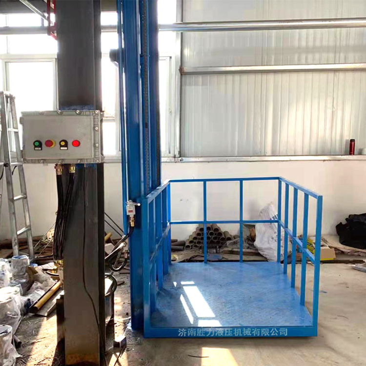 小型單軌式液壓升降貨梯是由導(dǎo)軌、臺(tái)面、鏈條、油缸、泵站、控制系統(tǒng)等組合而成的一種常見的液壓貨梯。