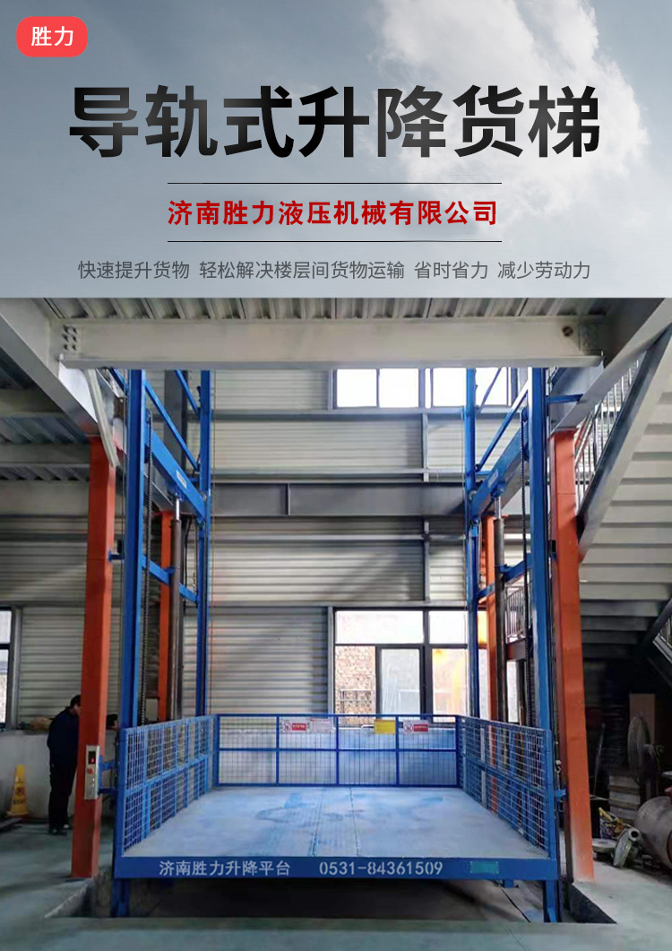 導(dǎo)軌式升降貨梯安裝無需地坑和機(jī)房,頂層高度不受限制,室內(nèi)外都可以安裝使用。