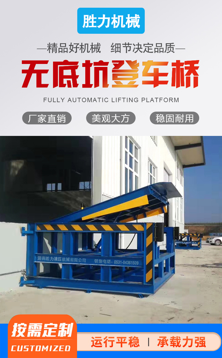無(wú)底坑登車橋是可以不需月臺(tái)不需挖坑的裝卸輔助設(shè)備,本設(shè)備可根據(jù)貨車車廂不同高度調(diào)節(jié)即可調(diào)高也可調(diào)低,它的高度調(diào)節(jié)功能使貨車與庫(kù)房的貨臺(tái)之間架起一座橋梁,方便叉車駛?cè)胲噹麅?nèi)部進(jìn)行貨物的批量裝卸。設(shè)備采用進(jìn)口液壓泵站,兩側(cè)設(shè)有防軋裙板,工作更加安全,僅需單人作業(yè),即可實(shí)現(xiàn)貨物的快速裝卸。固定登車橋可使企業(yè)減少大量勞力,提高工作效率,獲取更大經(jīng)濟(jì)效益。無(wú)底坑登車橋被廣泛應(yīng)用在裝卸車頻繁、車型不一的大型企業(yè)、倉(cāng)庫(kù)、車站、碼頭、倉(cāng)儲(chǔ)物流基地、郵政運(yùn)輸、物流配送等。